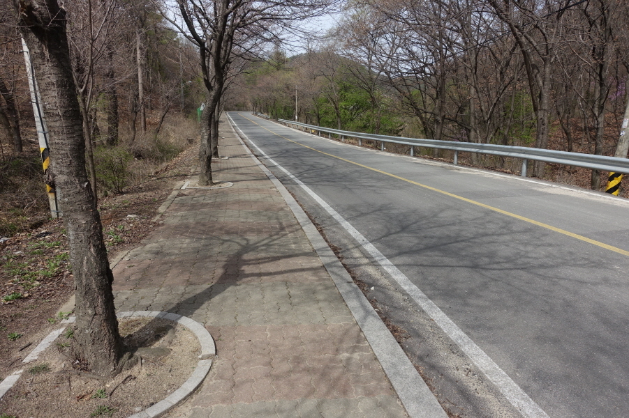 임도를 따라 가파르게 내려서면 2차선 도로다. [0.2km][5분]