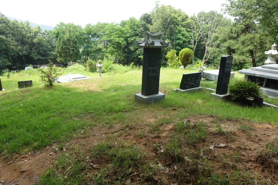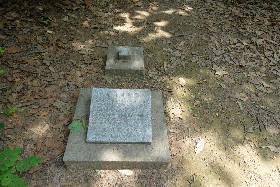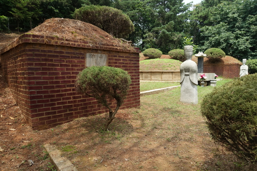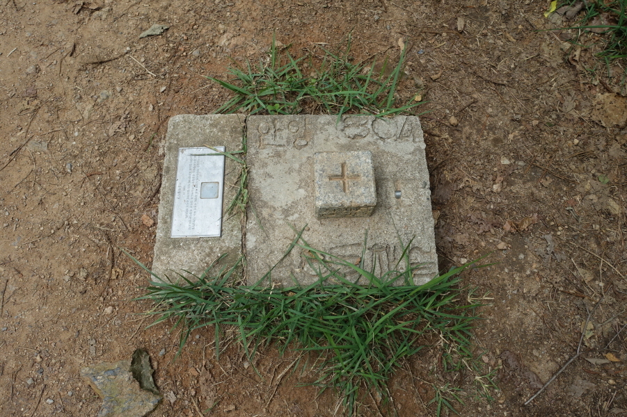 좌측으로 없는 길을 개척으로 치고 오르니 (12;25) “치산”이란 표지석이 박힌 출입문 담이 설치이 설치되고 울타리로 둘러 막은 석물갖춘 묘지 2기를 만난다.