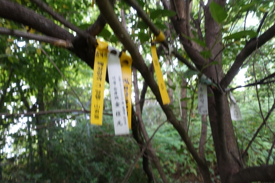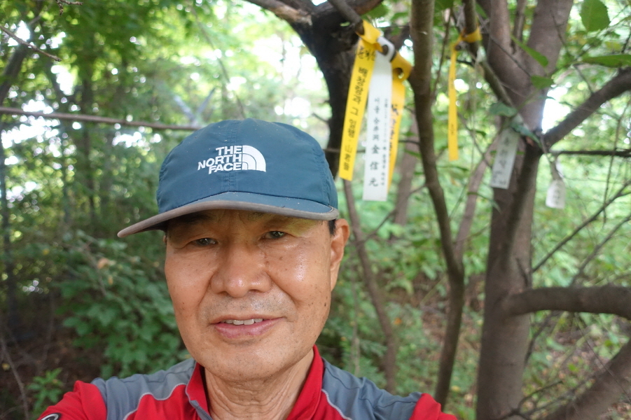 정상은 옆쪽으로 군부대가 보이는 곳이며 그 흔한 정상표지판도 표지석도 없고 선답자님들의 표지기 몇장이 걸려있을 뿐이다. (cf 바위가 한 개 놓인 정점에서 하산길은 다시 부천 천문과학관으로 내려서는 길이다.)잠시 알바하고 되돌아 올라와(정상에서 2m Back) 3거리에서 우향 군부대 방향 공터로 내려선다.