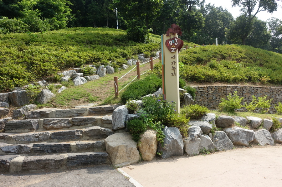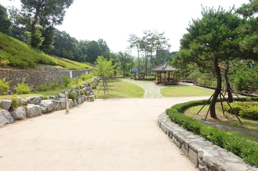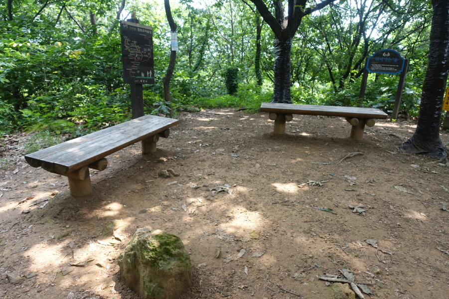 3거리에서 우측으로 내려서면 (10;22) 정자를 만나고 (10;23) 이정표(백만송이장미원/벚꽃동산)를 지나 (10;24) 깨끗하게 보이는 작은 우물(음용불가)을 지나고 (10;26) 데크공연시설을 지나 내려서 우측능선으로 오른다.