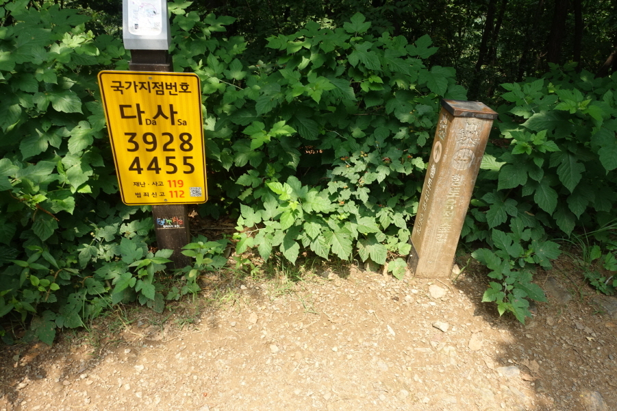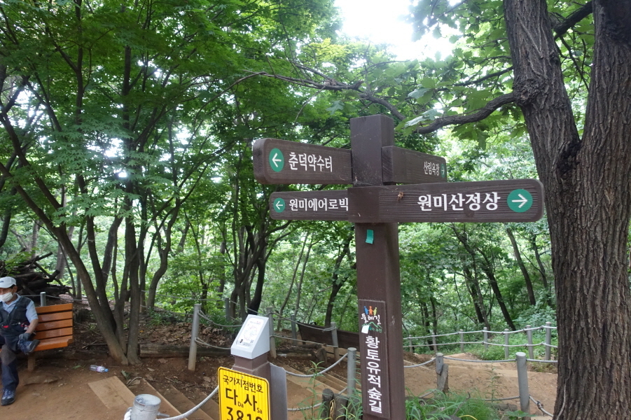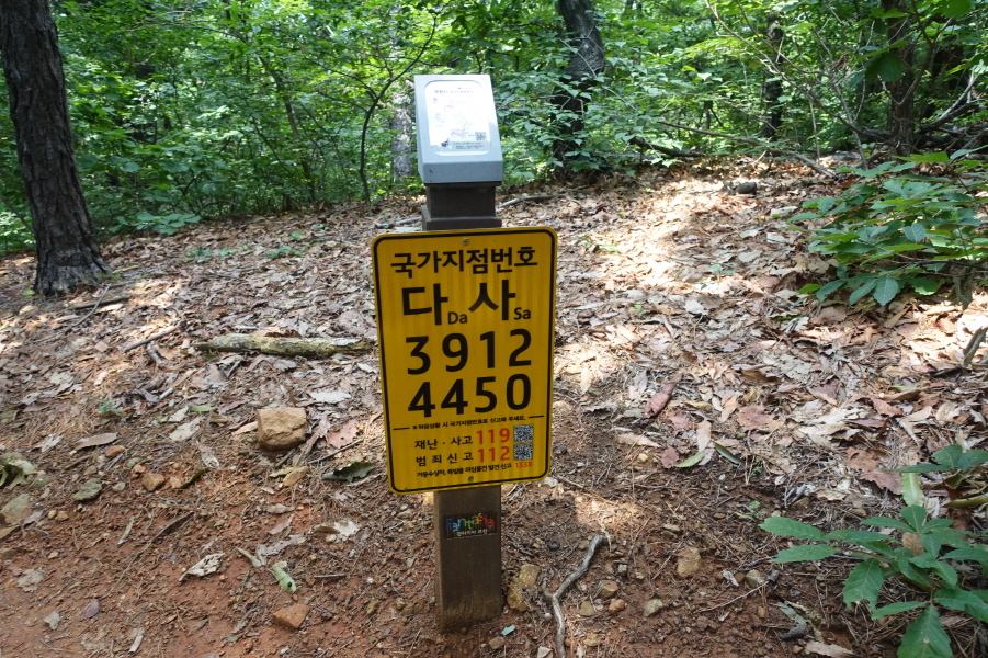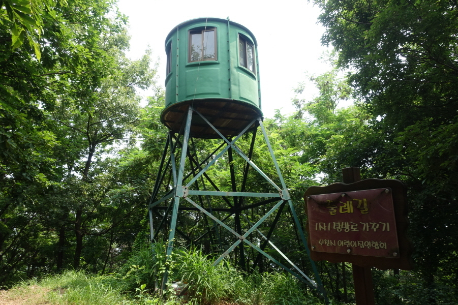 (13;10)반사경 서있고 이정표(부천식물원/역곡안동네/원미산) 서있다. 아무런 표시없는 임도를 2m 정도 진행후 우측 산길로진입한다. 좌측으로 능선길 이어가면 (13;15) 국가지정번호 다사3912 4450)을 지나고 (13;20) 산불감시초소봉에 선다.[1,1km][20분]