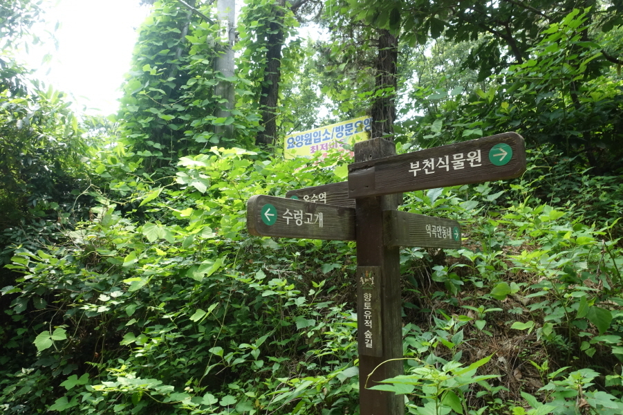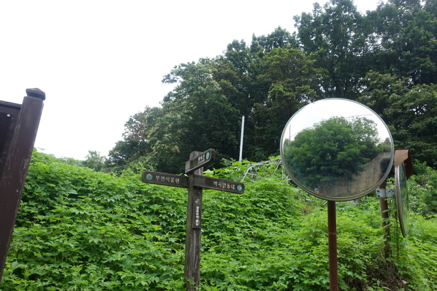 (13;10)반사경서있고 이정표(부천식물원/역곡안동네/원미산) 서있습니다. 아무런 표시없는 방향 임도를 2m 정도 진행후 우측 산길로진입합니다.