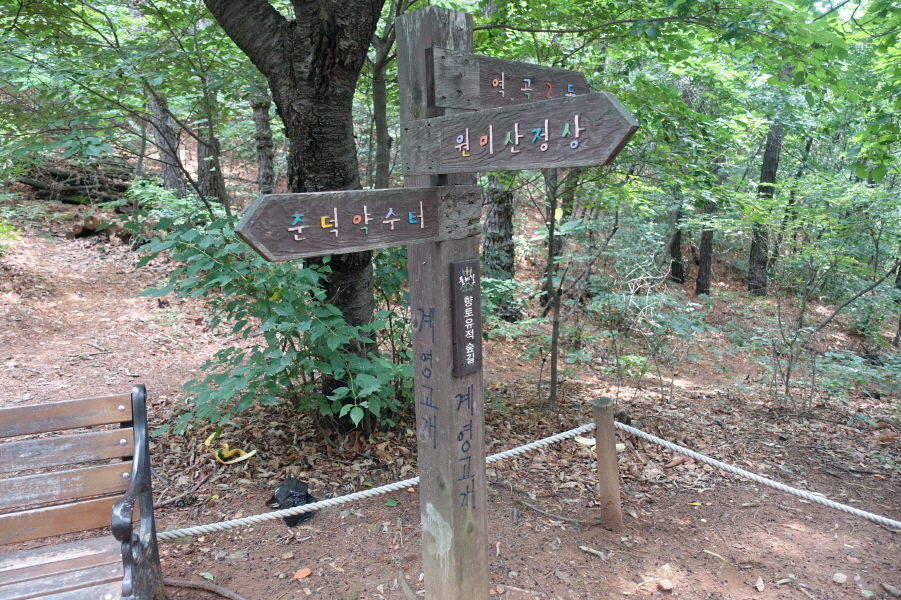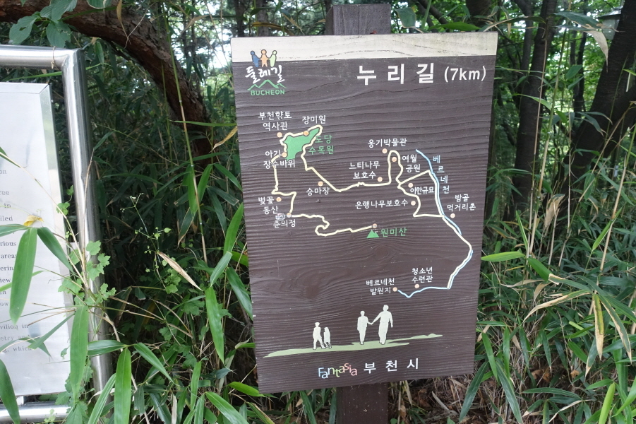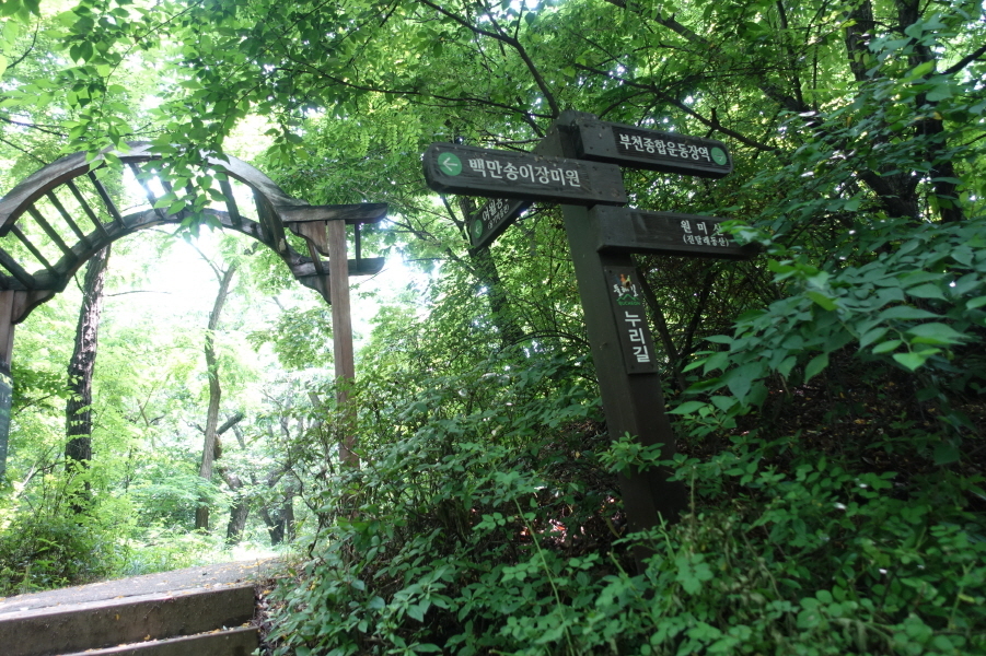 (10;50) 옹기박물관에서 건너오는 소공원에서 데크길따라 능선에 붙어 우측으로 간다. (10;53) 이정표(원미산/부천종합운동장역/백만송이장미원/여월옹기박물관)를 지나고 (10;54) 임도상 이정표(원미산/부천종합운동장역/백만송이장미원/여월옹기박물관) 만나 이정표(원미산방향 임도를 따르지 않고 아무런 방향 표시가 없는 직진 능선길을 진행한다.
