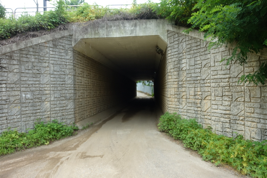 돌 우측에 수로따라 맑은 물이 많이 흐른다. 도로3거리에서 아랫길로 가서 지하통로를 빠져 나와야 하는데 직진으로 나와 (13;04)역곡로를 횡단보도로 건너나 밑에 이정표와 반사경이 보이는데도 좌측으로도 우측으로도 내려설수가 없다. 왔다갔다 하다가 시간만 (13;04~13;10)[6분]보내고 할수없이 스텐 인도 방지 울타리를 넘어 내려서 확인하니 굴다리가 있다.(cf후답자는 역역곡로 오기전 3거리에서 아랫길로 진행 역곡로를 굴다리로 통과 하시길)