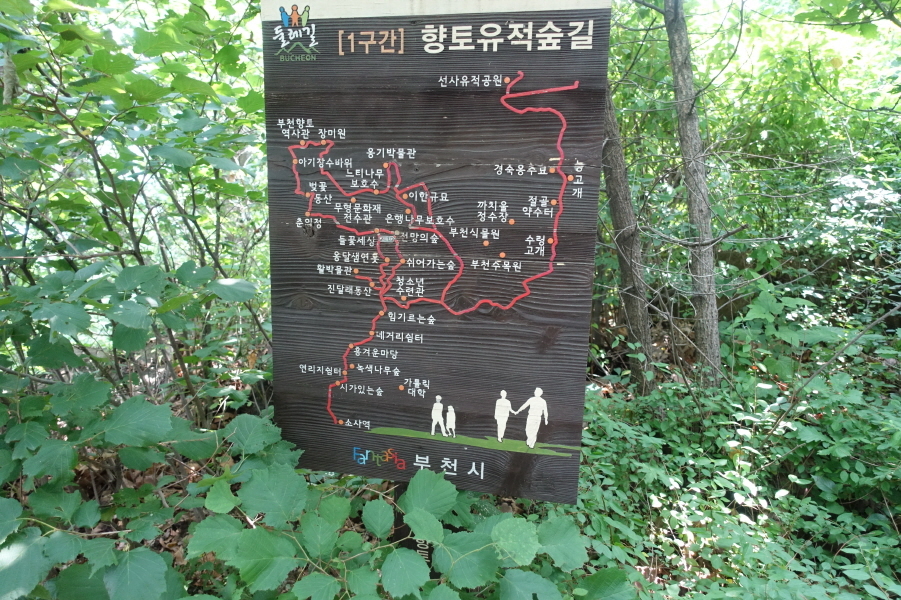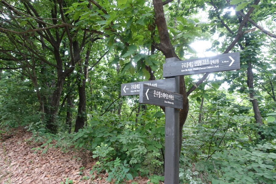 내림길 내려서면 (14;04) 구올레길 산림체험2코스(참새공원) 입간판 서있는 들날머리다. 도로따라 내려가 좌측으로 이동 횡단보도건너 (14;05)온수역에서 산행종료한다.[0.8km][10분]
