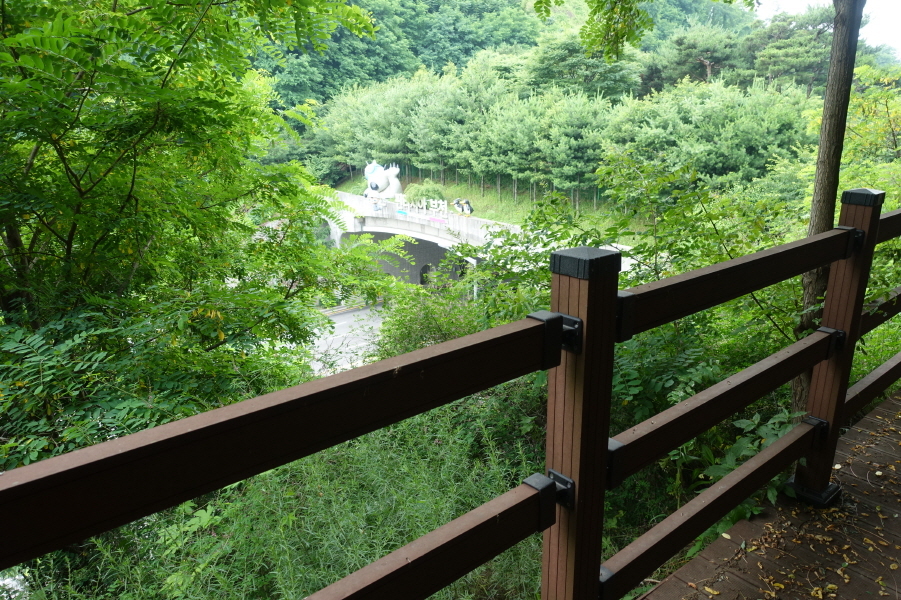 능선길이 좌측으로 곡각되는 지점에서 긴 목책계단을 내려서고 (11;05) 길주로를 동물이동통로를 통해 건넌다.