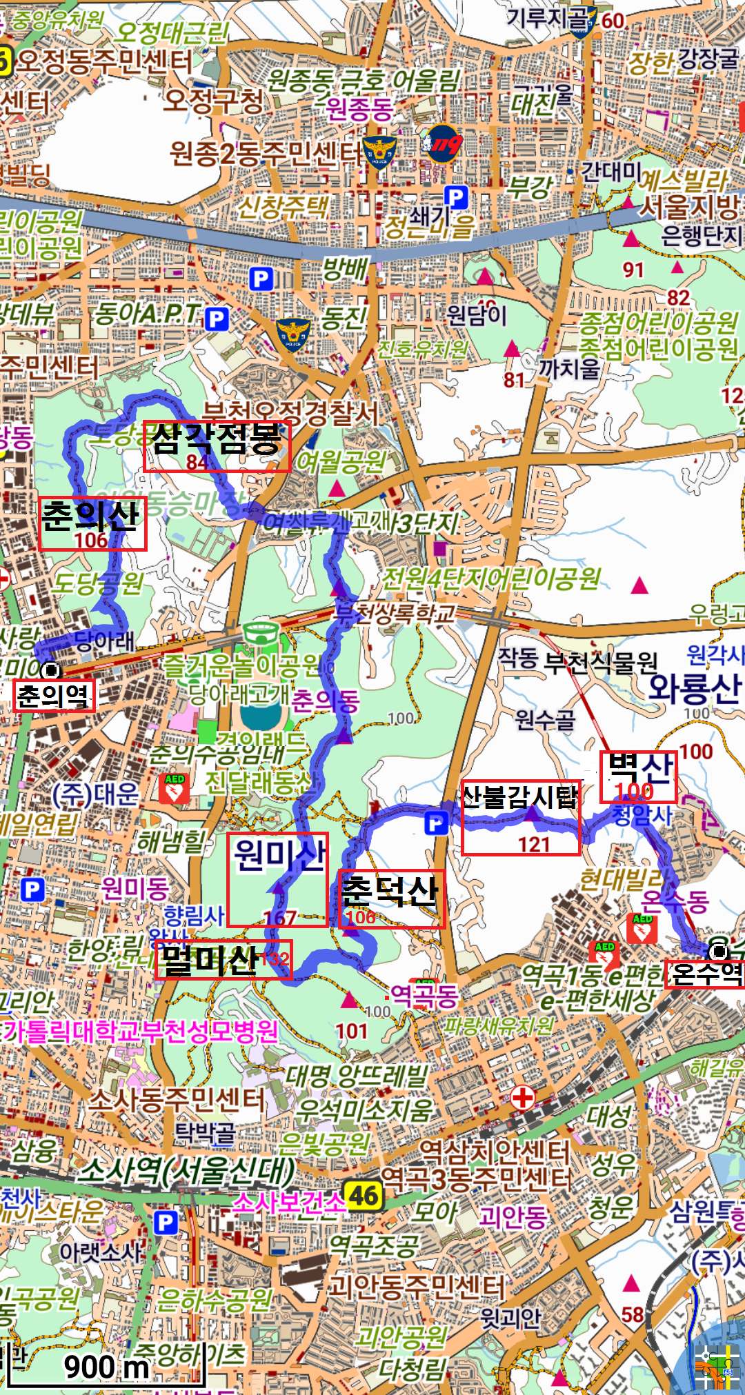 춘의산(106m), 원미산(167m), 말미산(132m).춘덕산(106m).봉배산(121m).도당산(98m).벽산(91m)/경기 부천