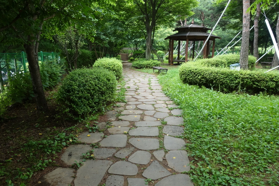“해담숲 여가녹지” 입간판 서있고 우측아래 소공원 꾸려있다. 목책계단을 밟고 메트길따라 간다. (09;48) 부천종합운동장역쪽에서 오는 등로와 만나 좌측으로 오름길 오른다. (09;48) 목책계단을 오르니 (09;52) 춘의정이다. (09;52)이정표(벚꽃동산/부천종합운동장역)와 춘의정 설명판 서있다.