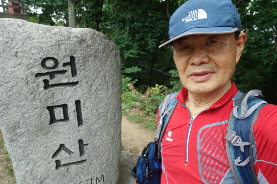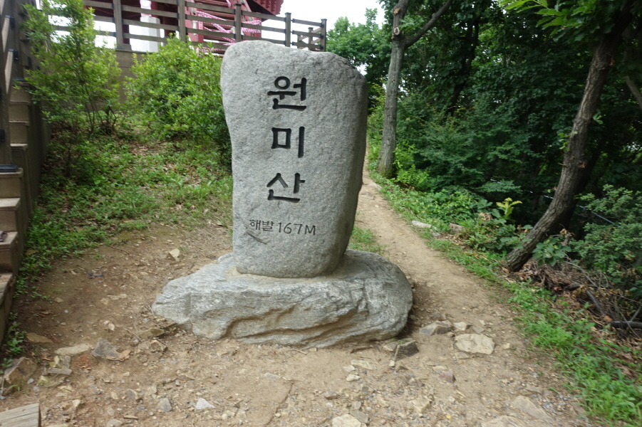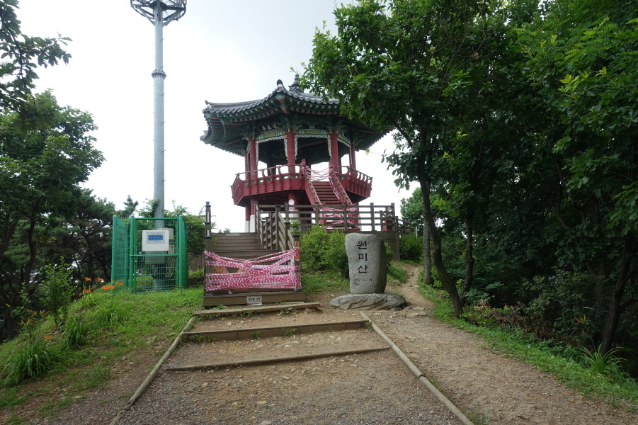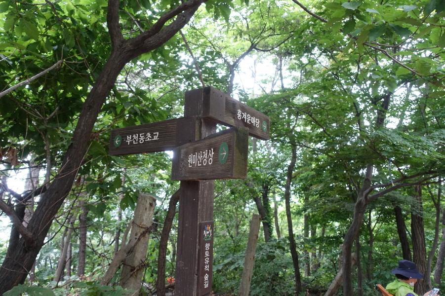 (11;14)“전망의숲” 표지판 서있고 정자 쉼터 있는 조망터에서 잠시 조망 즐긴다. (11;15)향토유적지숲 이정표(한샘약수터/종합운동장/부천상록중학교)를 지나 (11;30) 벤치정상과 이정표(진달래동산/부천상록중학교/한샘약수터),(11;40)이정표(원미산정상/현충탑/진달래동산)을 지나 오르니 정상석있는 원미산 정상이다.[3.2km][80분]