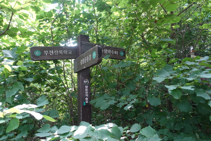 (11;15)향토유적지숲길 이정표(한샘약수터/종합운동장/부천상록중학교)입니다.