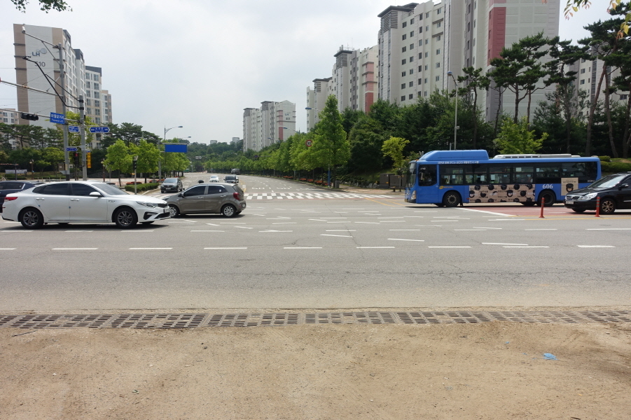 횡단보도 오기전 도로3거리에서 아래도로를 따라 굴다리를 통과해야 합니다.
