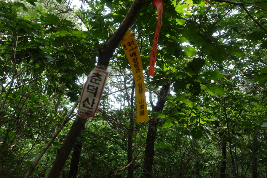 세럴산 찾아왔는데 춘덕산 이다. 작은 바위가 밖힌 봉이다. 동복배하사님이 부착한 작은 비닐코팅 춘덕산 표지판 부착되어있고 뉴 새마포산악회 표지기도 한 장 걸려있다.