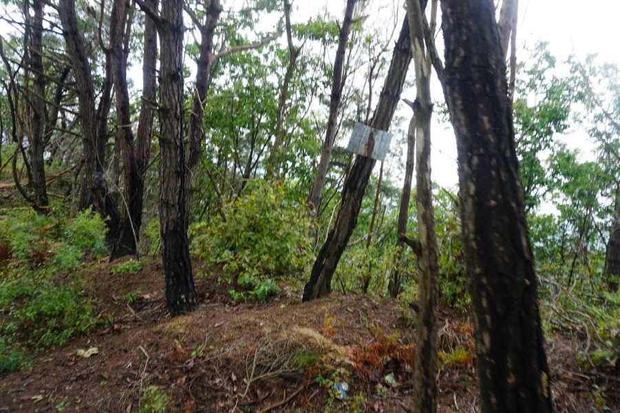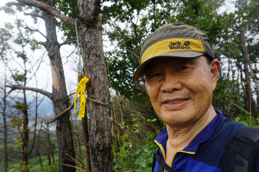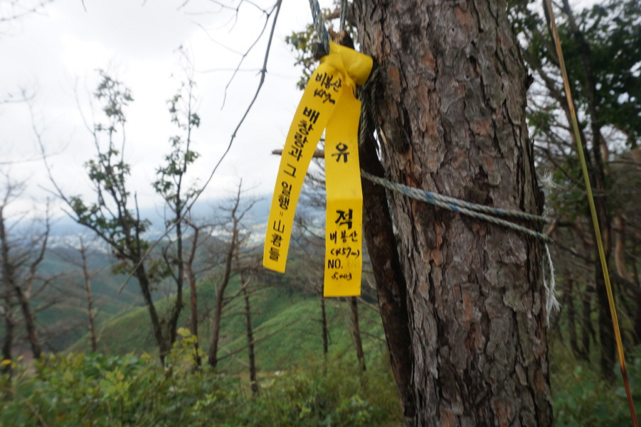 (10;02) 오름길은 넘어진 소나무 등걸이 귀찮게 가로막습니다. 넝쿨을 헤치고 급경사 암릉지대도 통과하여 어렵게 첫 봉을 오르고 내려 선후 다시 올라 삼각점봉 깃대봉 정상에 섭니다.