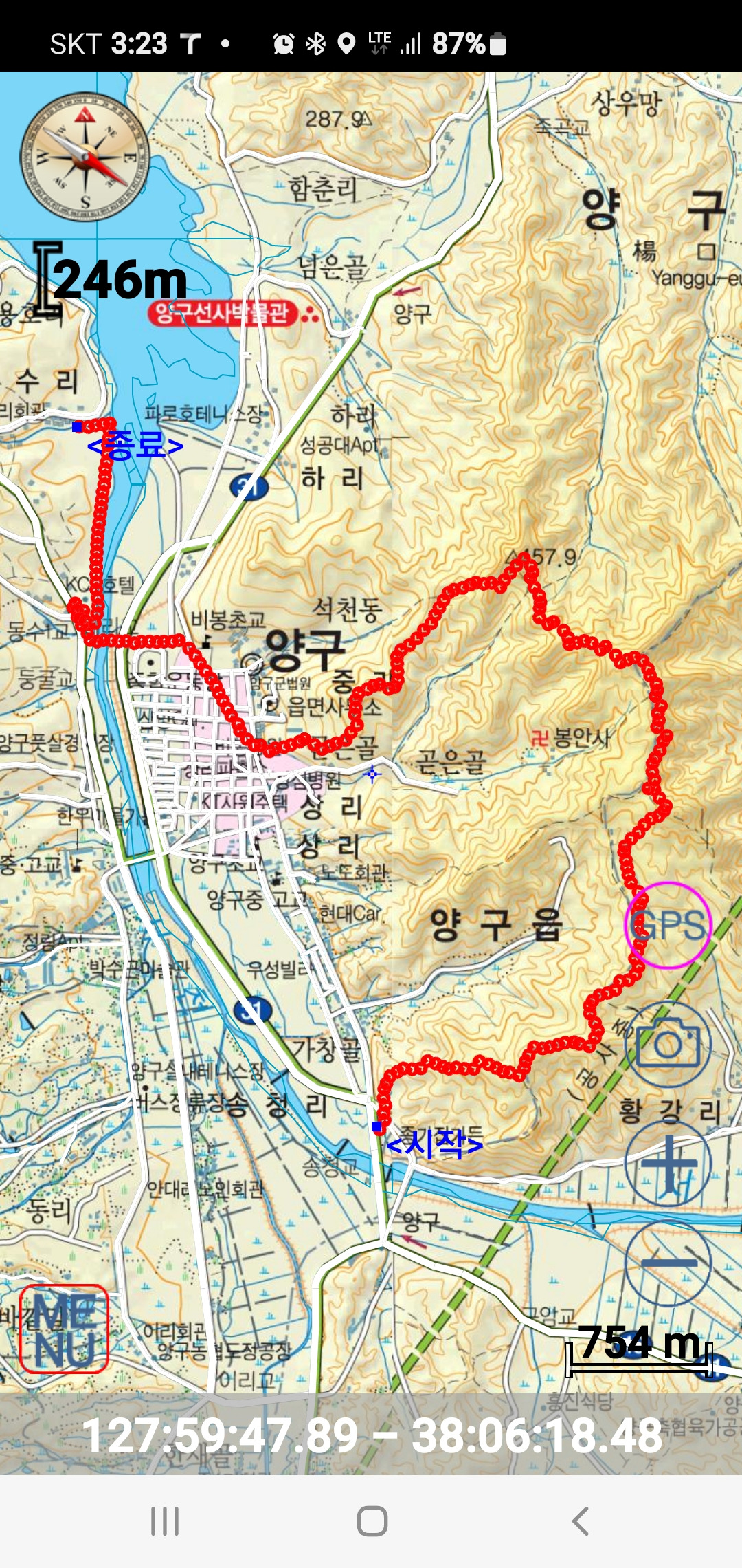 산악회코스는 일출봉 이후 농공단지를 지나 한반도섬을 트래킹 하는 코스로 잡았으나 배하사님, 임춘수대장님, 문일님, 배창랑 4인은 비봉공원 코스를 잡아 진행 아리솔 배하사님이 찾아낸 깃대봉(255m△강원 153), 비봉(228m), 둥굴 봉(213m △양구 427)을 답사 후 (13;03) 날머리용머리공원 인문학박물관에서 산행종료 (약 9.5km/3시간 30분) 합니다.