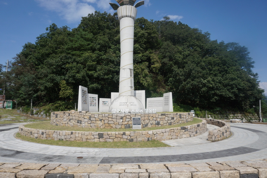 (12;45) 양구사랑 스포츠영웅탑입니다. 뒷산이 둥굴 봉(213m△양구 427)입니다. 좌측으로 도로 따라 고갯마루로 올라 우측 좋은 등로 따라 왕복합니다