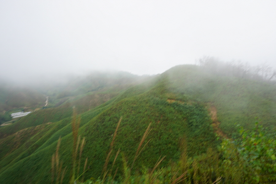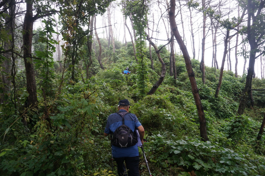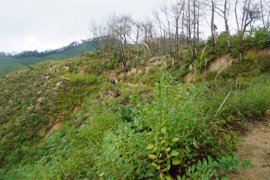 거친 풀숲 속 아무것도 없는 정상이다. 좌측능선을 잡목 때문에 바로 치고 내려설 수가 없어 약 10m Back우측사면을 통해 능선에 붙는다.