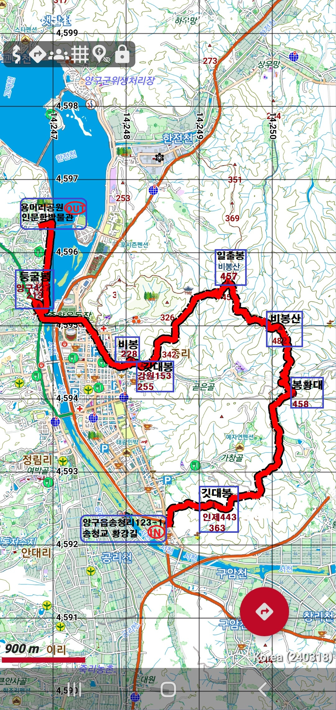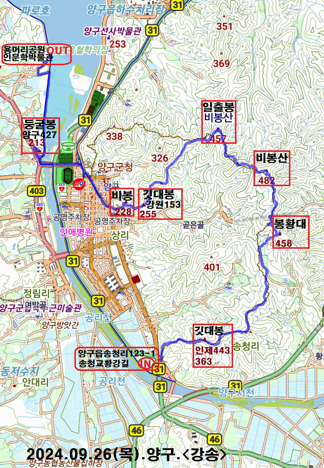 산행코스; 송청교지나황강길 (강원도 양구읍 송청리 123-1) 등산로입구→목책계단길 → 넝쿨잡목지대 → 깃대봉(363m△인제 443) → 임도 → 급경사 오름길 → 봉황대(458) → 좌측능선 → 묶은 임도 → 비봉산(482) → 일출봉(정상석 457) → 좌향 목책계단 → 깃대봉(255m△강원 153) →비봉(228) →양구읍내 → 서천 → 둥굴 봉(213m△양구 427) → 서천 자전거도로 → 용머리공원 인문학박물관 주차장