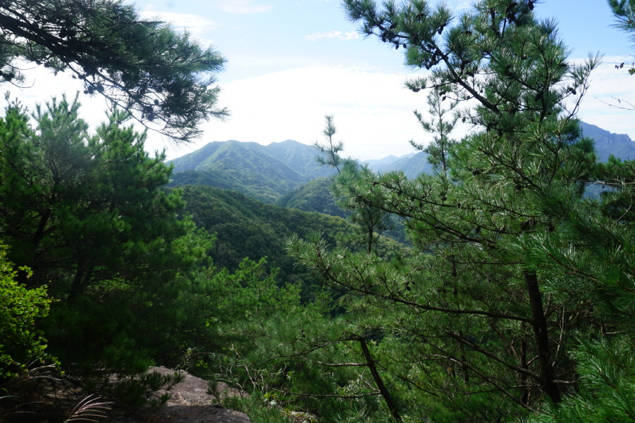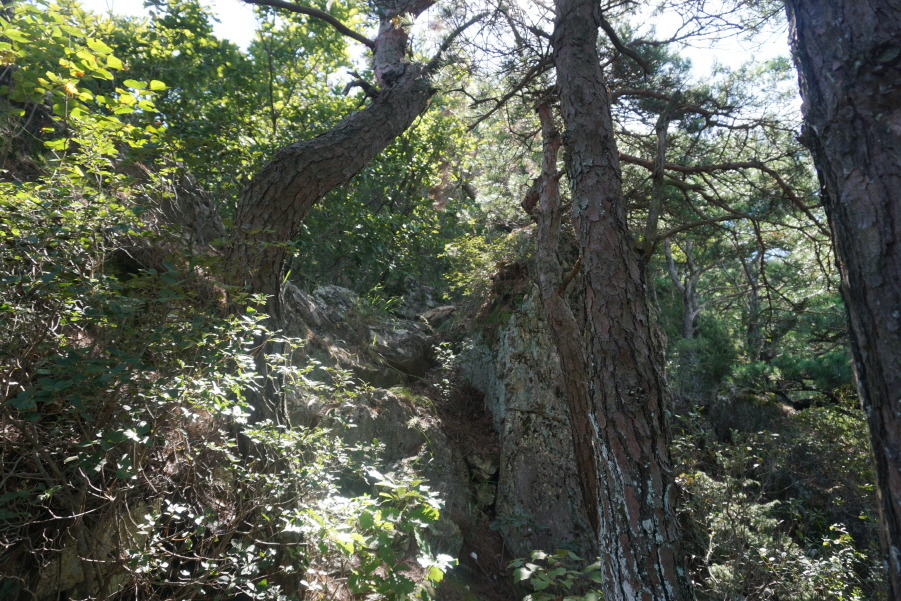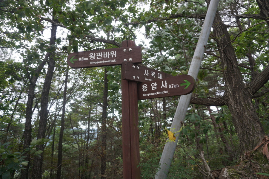 용암사 뒤편 능선은 기암(奇岩)의 전시장이다. 주능선과 만나는 삼거리에서 남쪽으로 조금 떨어진 곳에 틈새바위와 거북바위, 왕관바위 등이 솟아 있다. 능선 서쪽 금천계곡 너머로 웅장한 모습의 서대산이 마주 보인다. 금강산의 축소판 같은 기암 지대를 구경하고 발길을 돌려 북쪽의 사목재로 내려섰다. 무릎이 시큰거릴 정도로 가파른 내리막이다.