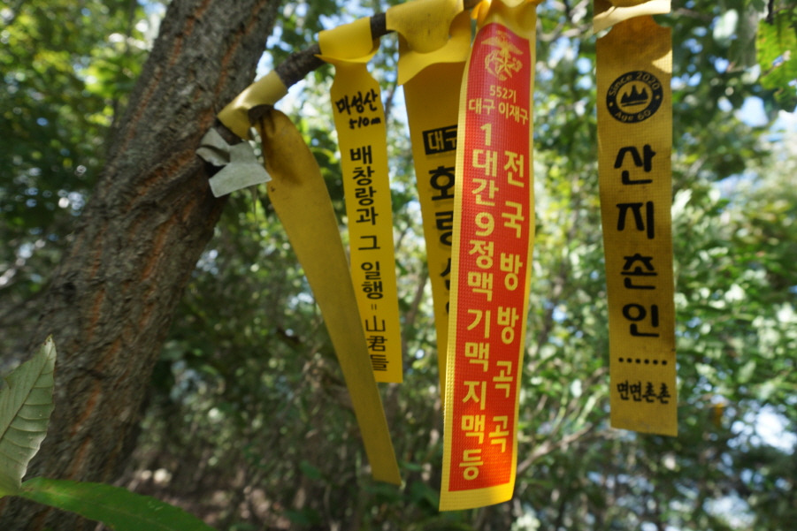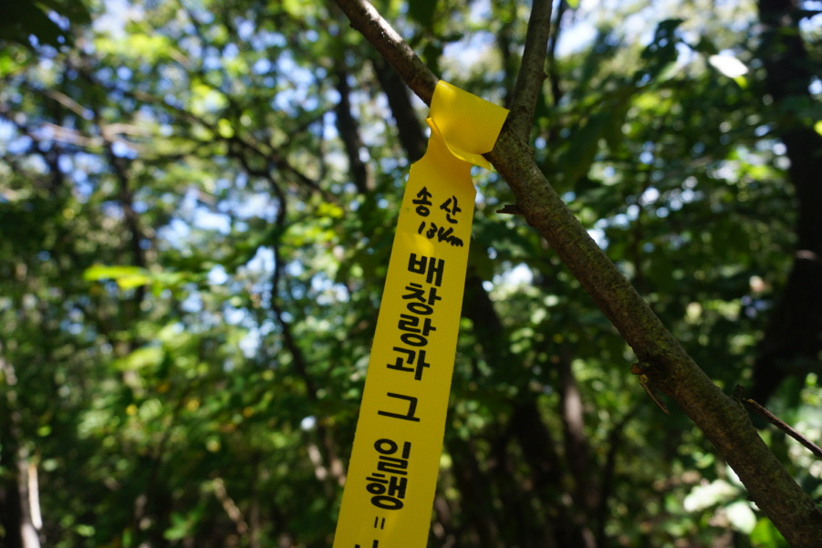 (10;40) 오래된 제 표지기"배창랑과 그 일행=山君들"을 만납니다. 기억이 없는데 아마도 마성산만을 왕복할 때 (?) 부착한 표지기인듯싶습니다