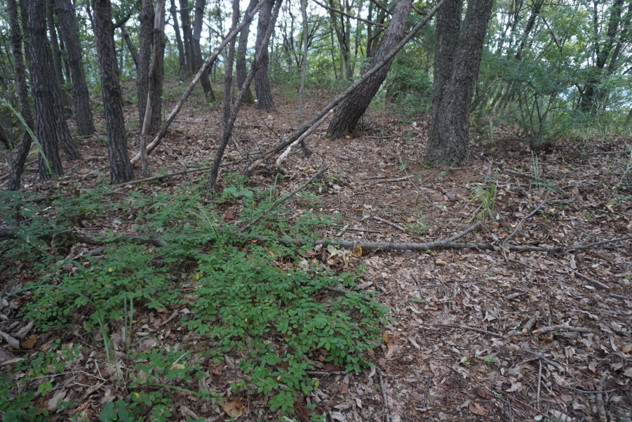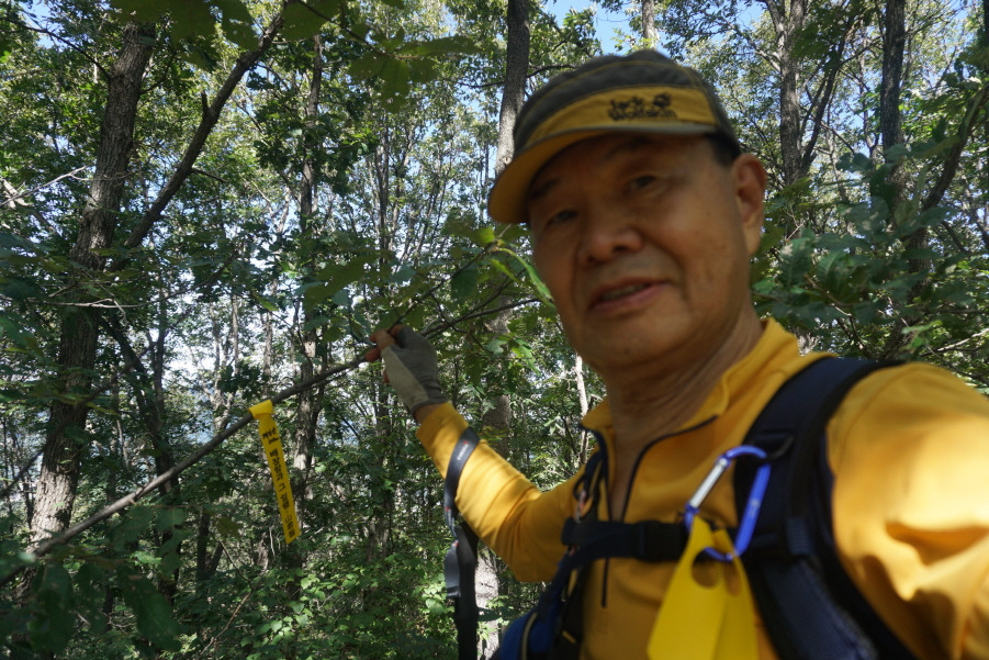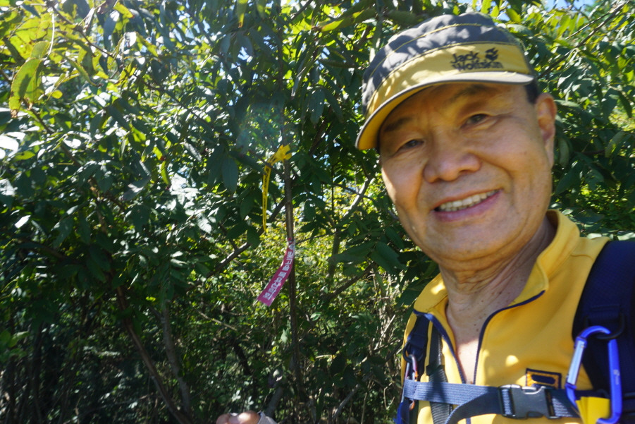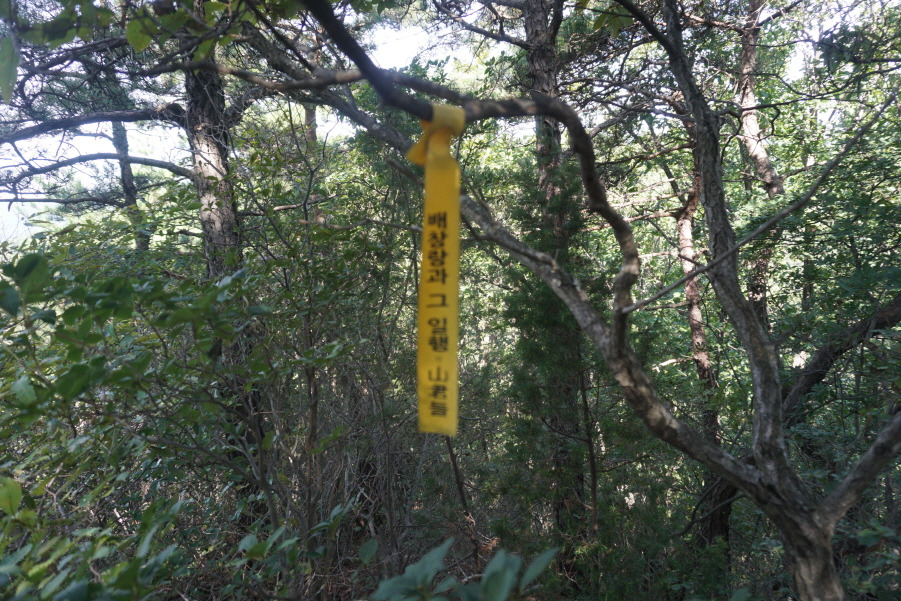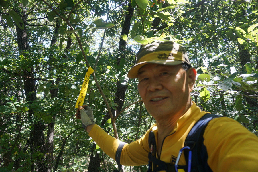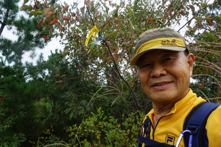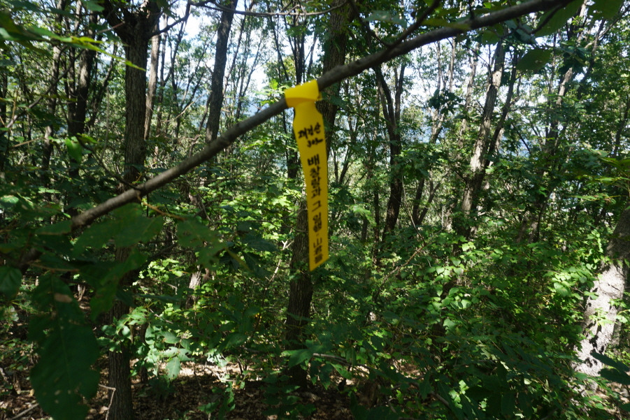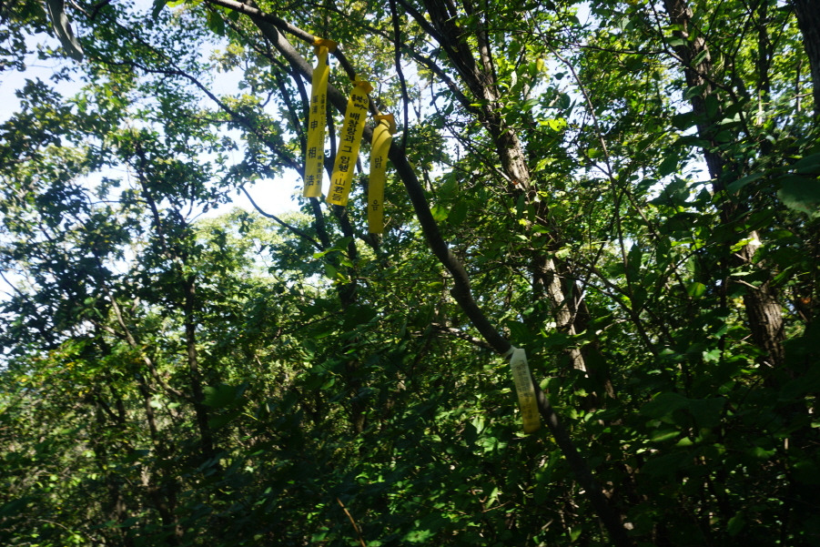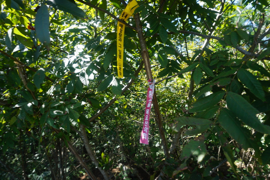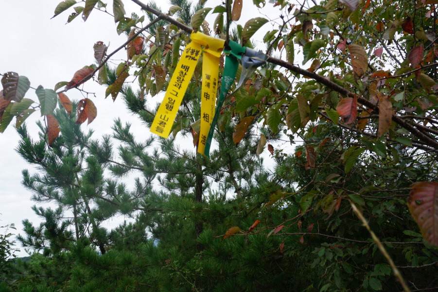 (13;35) 깃대봉(132m) 정상 故문정남 선생님 표지기 걸린 가지 밑에 표지기"깃대봉 132m 보은 463 배창랑과 그 일행=山君들"부착합니다. 삼가 故人의 명복을 빕니다.