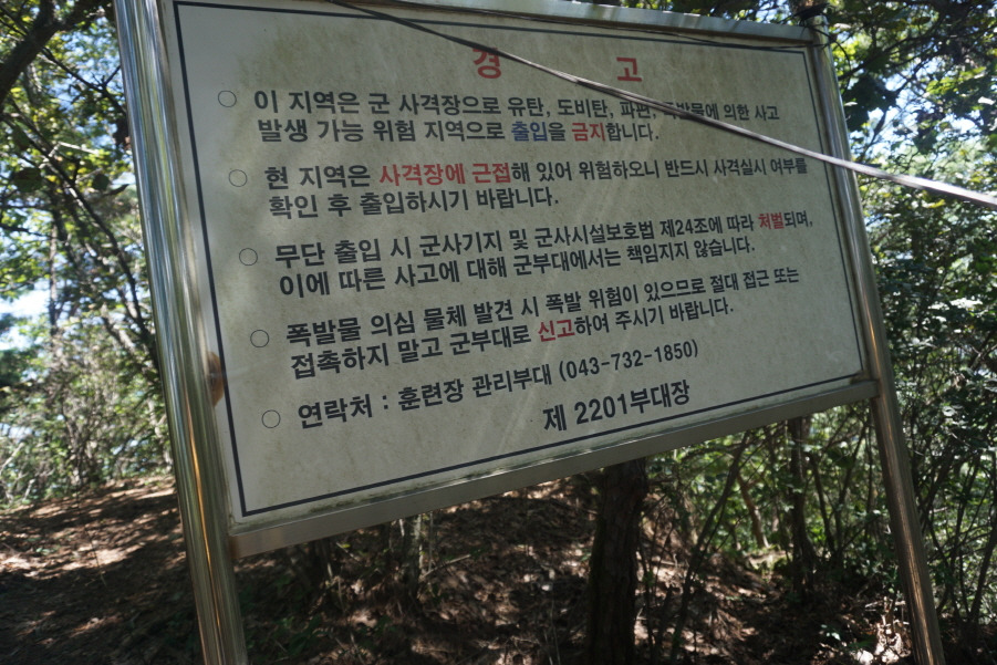 (11;42)"이 지역은 사격장에 근접해 위험하오니 반드시 사격실시여부를 확인 후 출입하시기 바랍니다. 훈련장 관리부대 연락처 043-732-1850)" 경고판을 지납니다. 훈련장 관리부대 연락처 (043-732-1850)로 전화해보니 사격훈련이 없답니다. 통과해도 좋다고 합니다. 우측아래 사격훈련자이 보이지만 사진은 남기지 않습니다. 군사시설은 절대로 찍어서 산행기록에 남기지 않기로 했기 때문입니다.