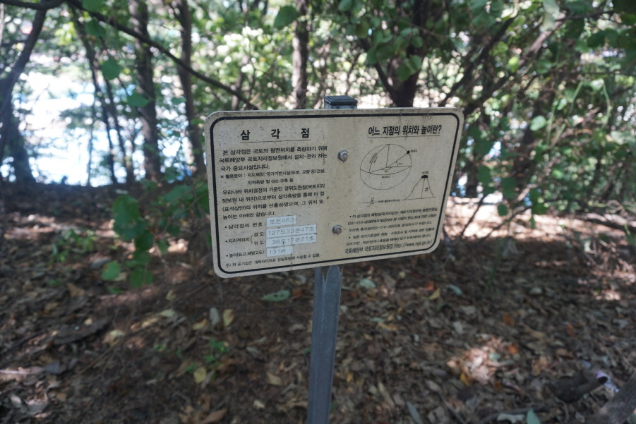 (13;35) 깃대봉(132m) 정상 삼각점(보은 463)과 그 설명판입니다.