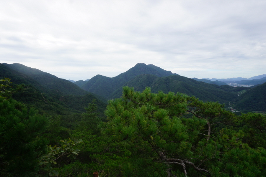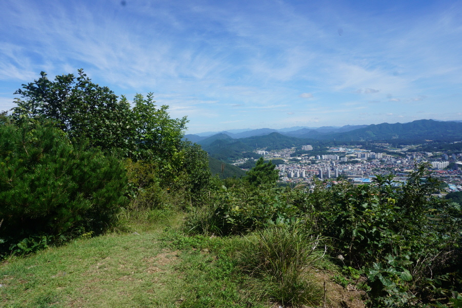 용봉 정상은 옥천 시가지를 조망하기 좋은 멋진 전망대다. 주변을 가리는 나무가 전혀 없어 기분이 상쾌하다. 남동쪽 멀리 김천 방면으로 민주지산, 삼도봉, 황악산 등의 고산(高山)이 조망된다. 산정의 작은 잔디밭에서 숨을 돌린 뒤 다시 북쪽 능선을 타고 진행한다.