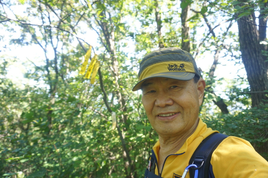 (11;23)동평산(407m) 정상 선답한 신상호 님과 맑음님 표지기 사이에 표지기"동평산 407m 배창랑과 그 일행=山君들" 겁니다.
