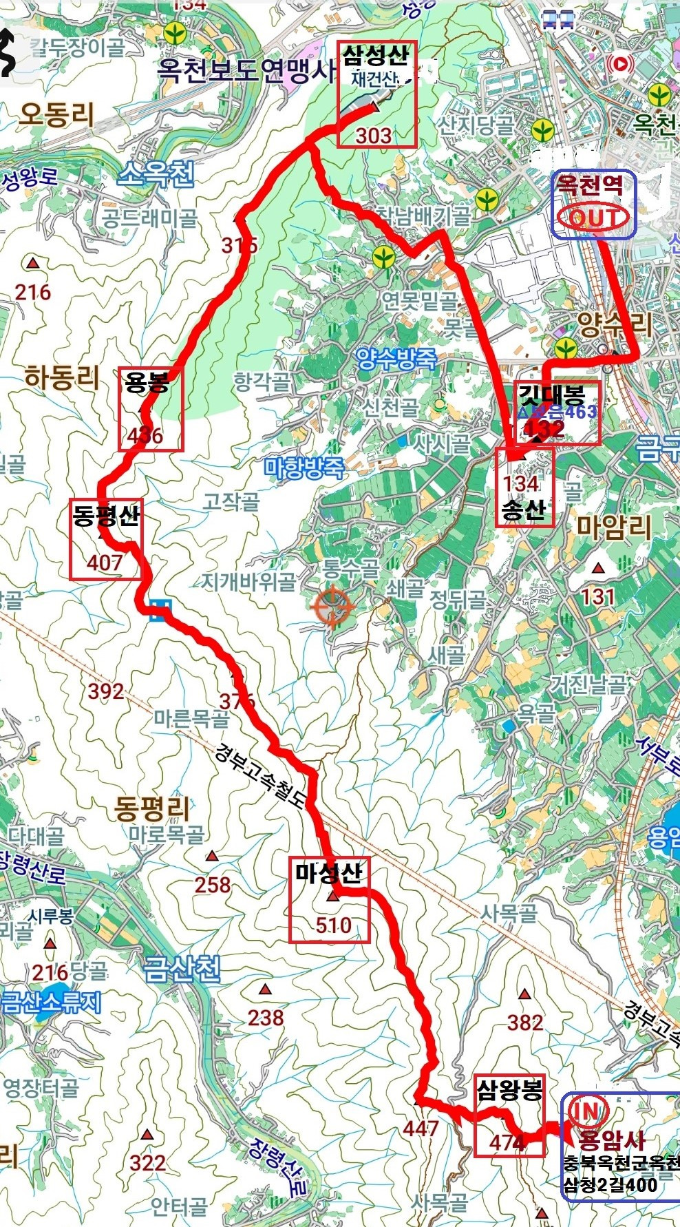 산행코스; 용암사(충북옥천군옥천읍 삼청 2길 400) 주차장→경내 돌계단 (운무대향)→데크계단길 →이정표 3거리(사목재 마성산/왕관바위, 장룡산/용암사) →431봉 → 삼왕봉(474) →암릉로프구간내리막길 →사목재임도(건너) →오름길 →447봉 →마성산성표지석 →돌탑 3기 → 마성산(510) (왕복)→돌탑 3기 →폐성벽길 → 육상등로 → 376봉 →헬기장 →동평산(407) →사격연습 시 출입금지경고판 → 용봉(정상석 436) →고개안부 4거리 →삼성산(재건산 303)(왕복) →양수로 4길 →마암리버스정류장 →송산(134) →깃대봉(132△보은 463) →경부선 고가도로 →옥천역