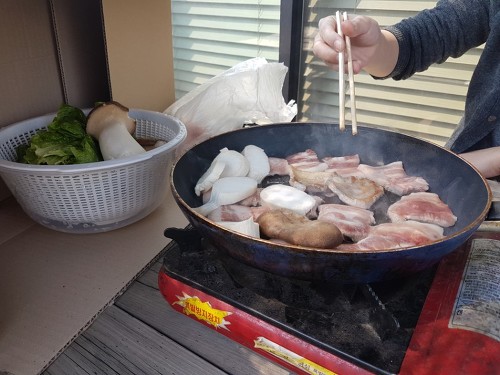 일요일 점심에 좀 일찍 만나서 테라스에서 고기를 구워먹었습니다. 지평막걸리 한 잔 하구요.. 먹는 것만 머슴;;
