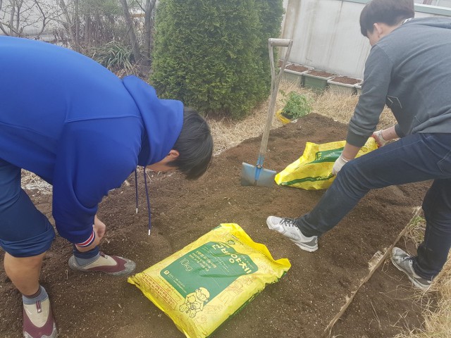 씨감자를 자르고 있는동안 알타리무를 심은 후 방치되어있던 텃밭을 퇴비와 함께 섞으며 싹 다 갈아엎었습니다.