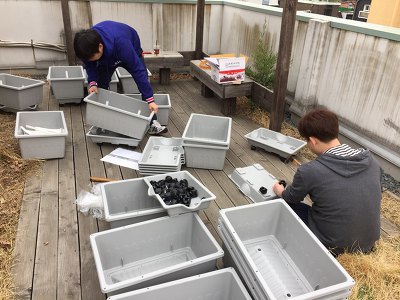 B형 상자텃밭 15개에 차곡차곡 새 흙을 채우고