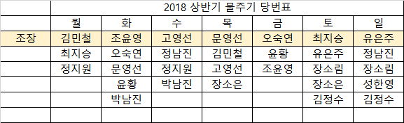 2018년 상반기 물주기 당번표 올려드립니다~ 총회 때 이야기한 것처럼 물만 주지 마시고 조별로 차도 한잔 하시고 친해지실 수 있으셨으면 좋겠네요. 각 요일별 조장님들은 해당 요일에 물 줄 수 있는 분들 확인하시고 없다면 단톡방에 상황 공유해주세요~