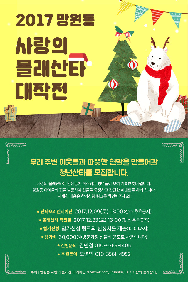 2017 사랑의 몰래산타 신청은 여기로! 작성자텃밭모임고영선|작성시간17.11.27|조회수37 목록 댓글 0 글자크기 작게가 글자크기 크게가 신청서 링크 https://goo.gl/forms/RbdGah67uR9WcuFU22017 망원동 사랑의 몰래산타 많이 신청해주세요 :) 다음검색 현재 게시글 추가 기능 열기 북마크 공유하기 신고 센터로 신고 댓글 댓글 0 댓글쓰기 답글쓰기 댓글 리스트
