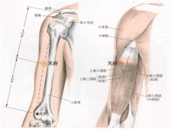 앞겨드랑주름과 尺澤(LU5)을 연결하는 선에서 위쪽으로부터 1/3, 아래쪽으로부터 2/3가 되는 지점에서 취혈한다.
