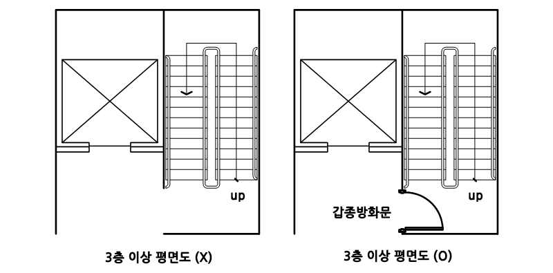 ② 3층 이상의 층과 지하층층마다 구획. 다만 지하 1층에서 지상으로 직접 연결하는 경사로 부위는 제외한다. 여기서 층마다 구획한다는 의미는 일반적으로 볼 때, 아래층과 위층이 연결되어 있는 계단실에 반드시 갑종 방화문이 설치되어야 한다는 것을 상정해 볼 수 있다.