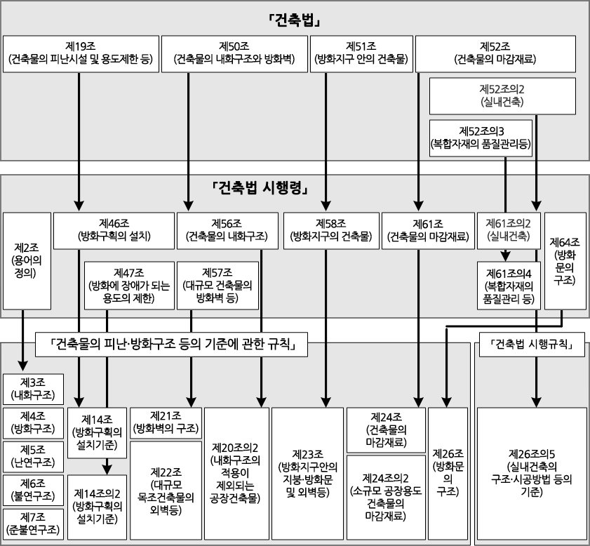 방화요건 규정은 내용상으로 볼 때, ①내화구조 건축물의 방화구획의 설치, ②내화구조가 아닌 1,000㎡ 이상의 대규모 건축물의 관리, ③건축물 차원: 실내ㆍ외 마감재료의 제한, ④도시차원: 방화지구 안의 건축물 관리 규정 등으로 구분할 수 있다. 결론적으로 「건축법」의 방화규정은 화재에 견딜 수 있는 내화구조와 화재의 확산을 방지할 수 있는 재료의 불연화를 목표로 한다.