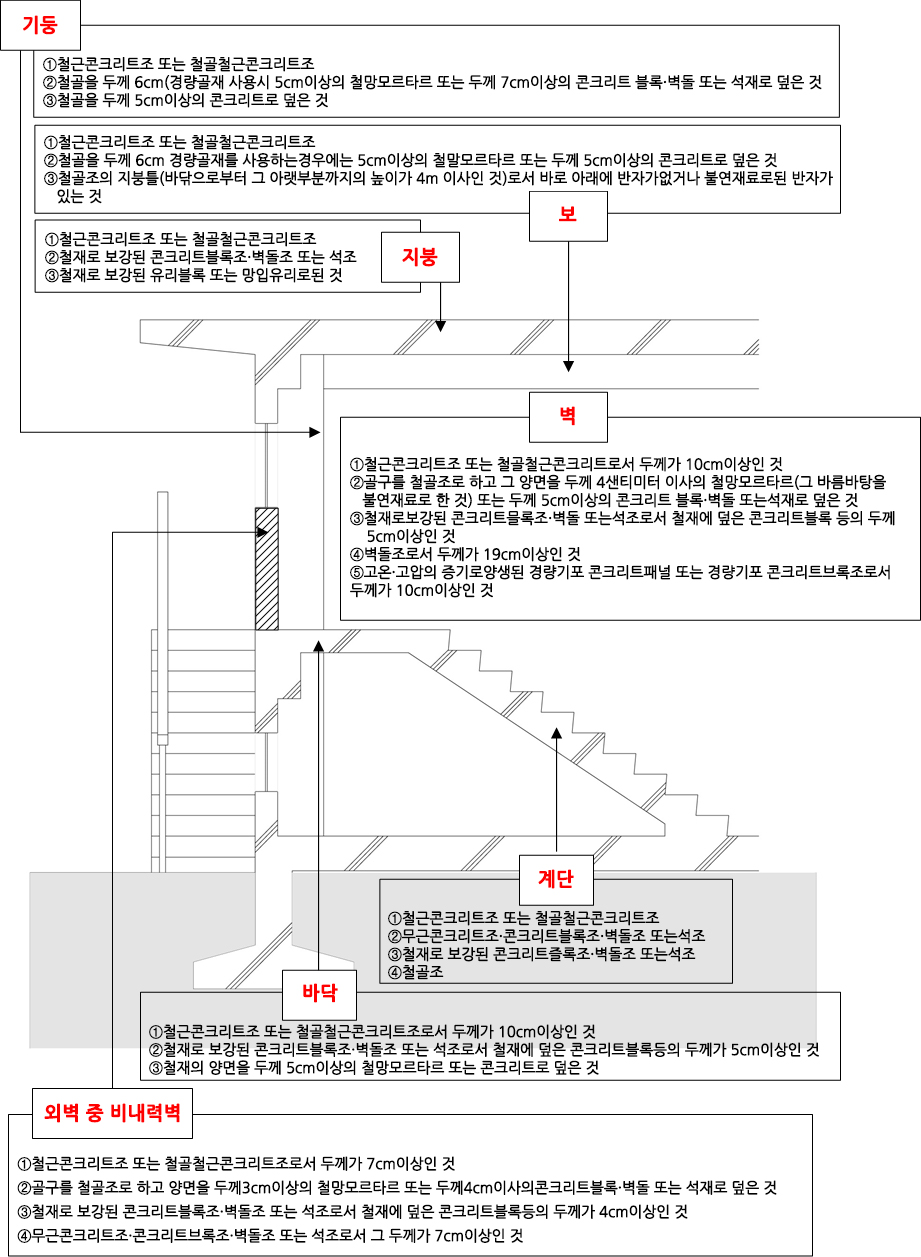 이러한 대피성능을 감안하여 「건축물의 피난ㆍ방화구조 등의 기준에 관한 규칙」(이하, 피난방화규칙)에서는 내화구조에 관해, 건축물의 구조요소별로 구조방식에 따라 두께 기준을 규정하고 있다. 예를 들어 바닥(slab)의 경우, 철근콘크리트조 또는 철골철근콘크리트조로 건축한 경우는 두께를 10㎝ 이상으로 하고, 철재로 보강된 콘크리트블록조·벽돌조 또는 석조로서 철재에 덮은 콘크리트블록 등은 두께를 5㎝ 이상으로 해야 하며, 철재의 경우는 양면을 두께 5㎝ 이상의 철망모르타르 또는 콘크리트로 덮은 것으로 시공하도록 하는 요건이 각각 규정되어 있다(피난방화규칙 제3조).