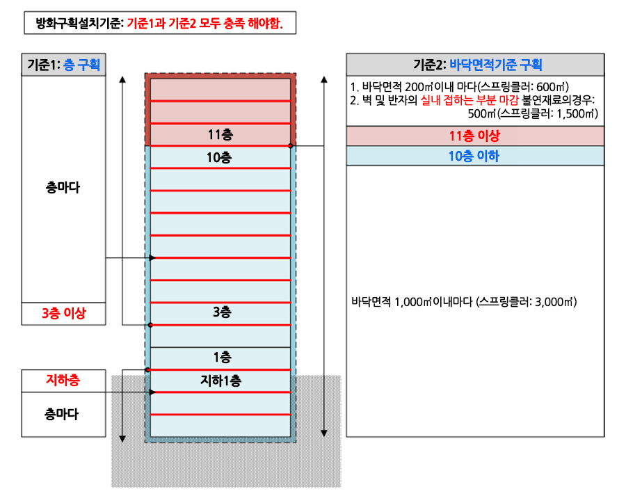 ③ 11층 이상의 층바닥면적 200㎡(스프링클러, 기타 이와 유사한 자동식 소화설비를 설치한 경우에는 600㎡) 이내마다 구획. 다만 벽 및 반자의 실내에 접하는 부분의 마감을 불연재료로 한 경우에는 바닥면적 500㎡(스프링클러, 기타 이와 유사한 자동식 소화설비를 설치한 경우에는 1,500㎡) 이내마다 구획 + 층마다 구획