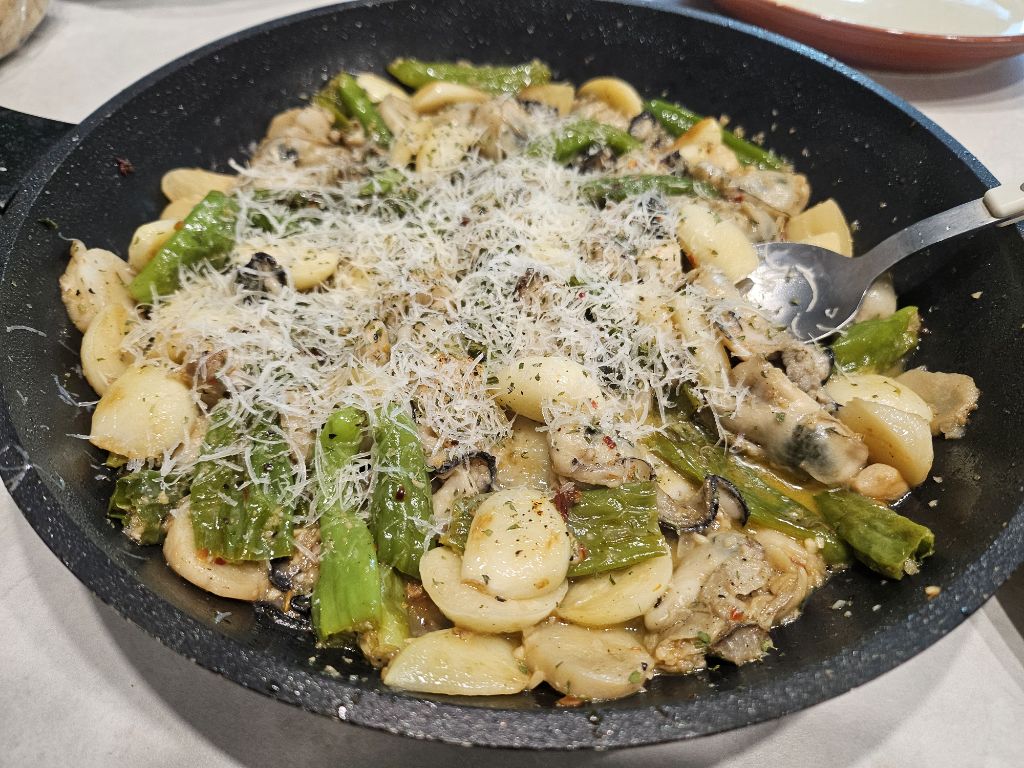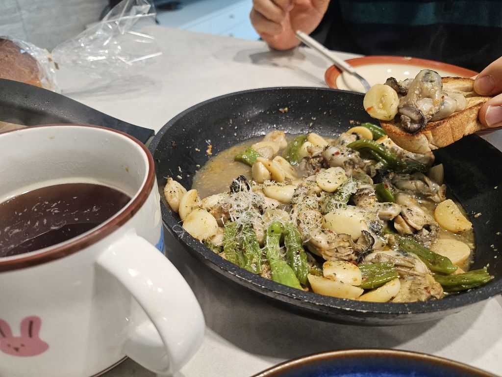 오늘 남편이 만들어준 거에요~ 자기말로는 굴 감바스라는데 제가보기엔 정체불명의 요리ㅎㅎㅎ (굴이랑 마늘외에 꽈리고추와 새송이버섯도 들어감)
