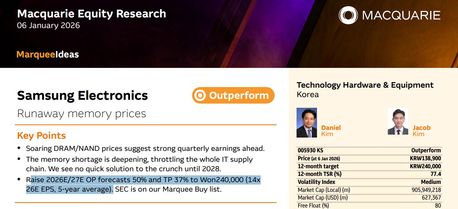 맥쿼리는 삼성전자에 관해 "치솟는 디램과 낸드 가격은 앞으로의 강력한 분기 이익을 예고한다"고 전망했다. 이어 메모리 공급부족이 심화하고 있는 데다 전체 정보기술(IT) 공급사슬을 옥죄고 있다"며 "이러한 상황이 2028년까지 빠르게 해결될 듯하진 않다"고 진단했다.
