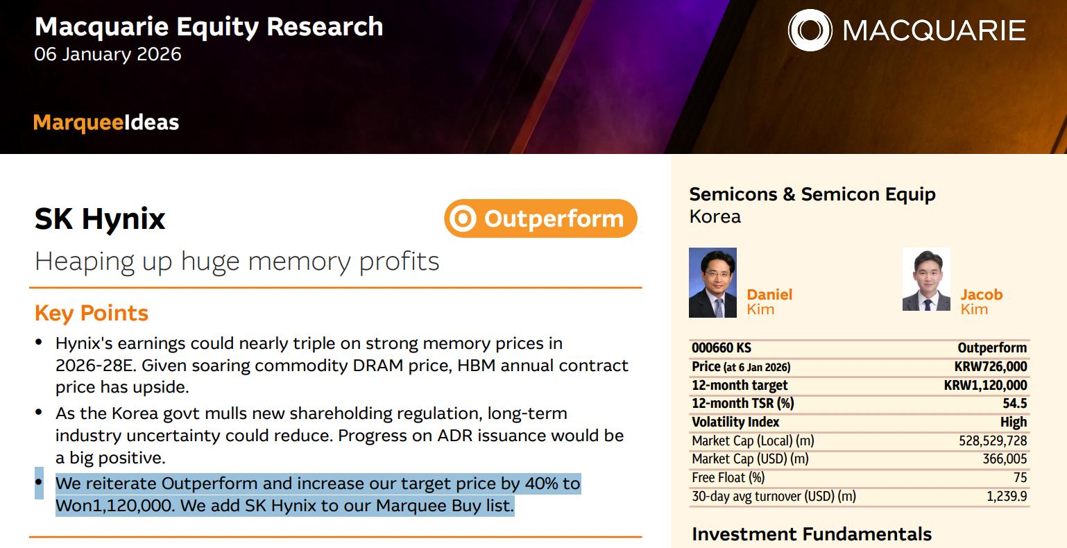 맥쿼리는 "한국 정부가 새로운 지주사 규제 검토로 장기적인 산업 불확실성이 완화될 가능성이 있다"며 "(SK하이닉스의) ADR(미국 주식예탁증서) 발행의 진전은 매우 긍정적이니 요소일 것"이라고 했다.