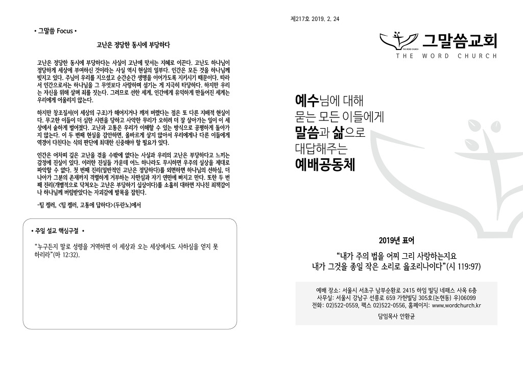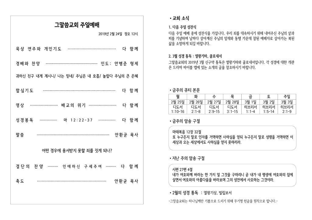 2019년 2월 24일 주보 작성자섬김이|작성시간19.02.23|조회수17 목록 댓글 0 글자크기 작게가 글자크기 크게가 교회주보0224.pdf 첨부파일첨부된 파일이 3개 있습니다. jpg 파일 교회주보0224.jpg jpg 파일 교회주보02242.jpg pdf 파일 교회주보0224.pdf 다음검색 현재 게시글 추가 기능 열기 북마크 공유하기 신고 센터로 신고 댓글 댓글 0 댓글쓰기 답글쓰기 댓글 리스트