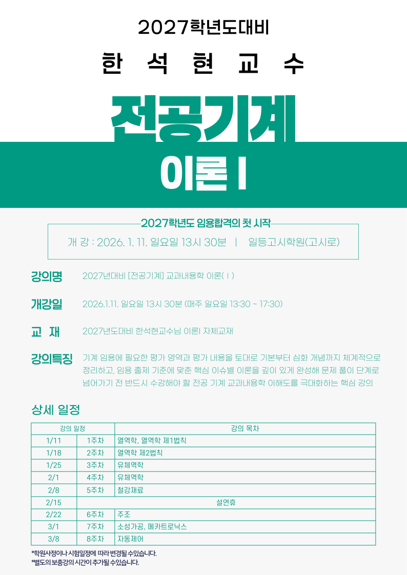 2027년대비 한석현 전공기계 <이론-1> 개강변경 일정 안내 작성자*일등고시학원|작성시간25.12.21|조회수72 목록 댓글 0 글자크기 작게가 글자크기 크게가 다음검색 현재 게시글 추가 기능 열기 북마크 공유하기 신고 센터로 신고 댓글 댓글 0 댓글쓰기 답글쓰기 댓글 리스트