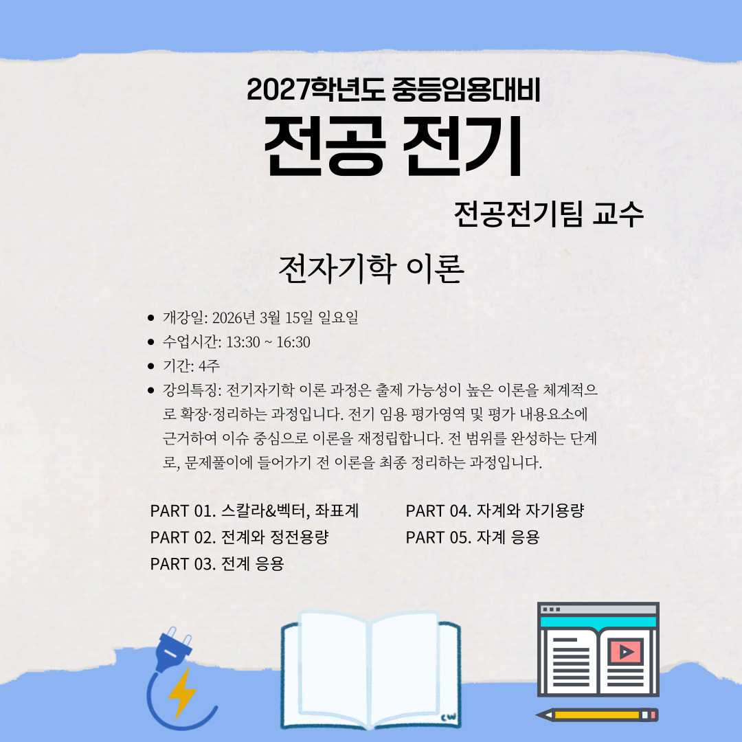 2027년대비 일등팀 전공전기 (전자기학) 강의안내 작성자*일등고시학원|작성시간26.03.05|조회수8 목록 댓글 0 글자크기 작게가 글자크기 크게가 다음검색 현재 게시글 추가 기능 열기 북마크 공유하기 신고 센터로 신고 댓글 댓글 0 댓글쓰기 답글쓰기 댓글 리스트