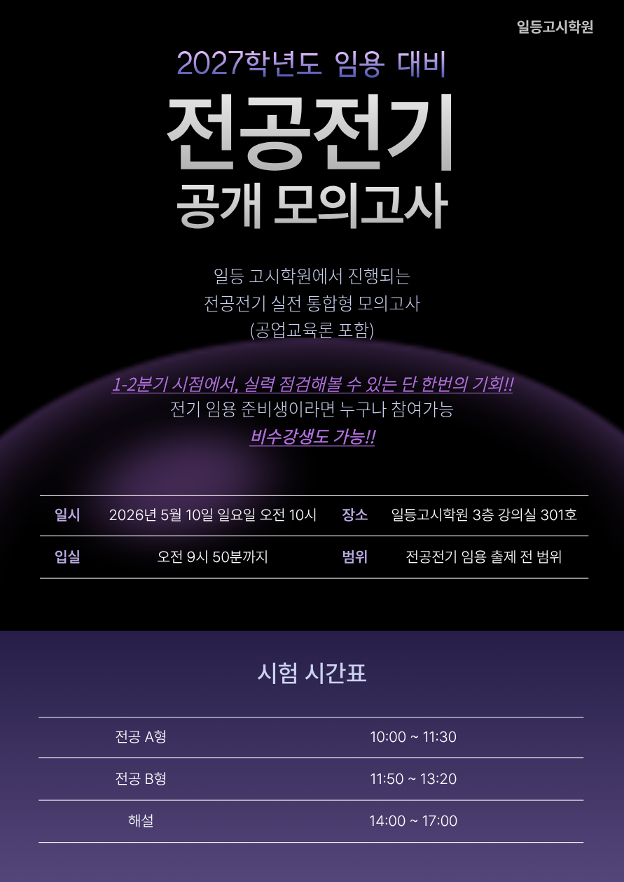 2027학년도대비 일등팀 전공전기 공개모의고사 안내 작성자*일등고시학원|작성시간26.03.01|조회수16 목록 댓글 0 글자크기 작게가 글자크기 크게가 다음검색 현재 게시글 추가 기능 열기 북마크 공유하기 신고 센터로 신고 댓글 댓글 0 댓글쓰기 답글쓰기 댓글 리스트