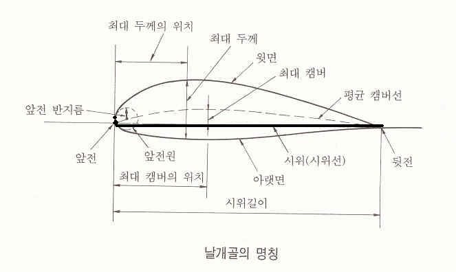 날개꼴(Airfoil) : 공기속을 뚫고 움직일 때 양력을 발생시키는 날개의 단면 형태(날개의 반절을 잘라 옆에서 본 모습)