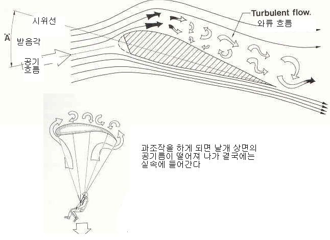 플레어링(Flaring) : 최대 속도로 사람 키높이까지 내려와 조종줄을 일시에 왕창 잡아당겨 착륙 - 풍속이 약할 때 주로 사용한다