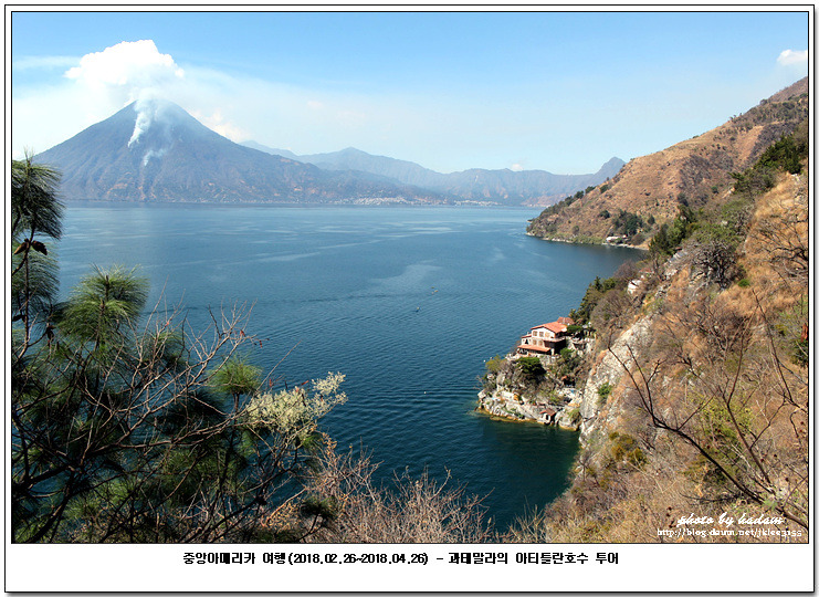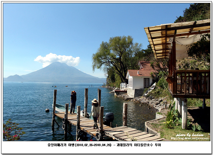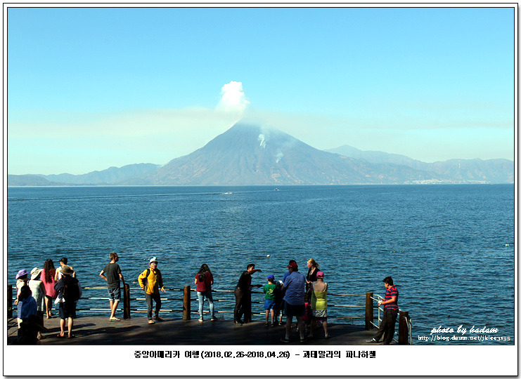 호텔에서 10분 정도 걸어가면 나타나는 아티틀란 호수...건너편에 보이는 것이 산페드로 화산입니다. 화산 중간에 피어 오르는 연기는 화산으로생긴것이 아니고 화전민들이 밭을 일구는 것이라고 합니다.