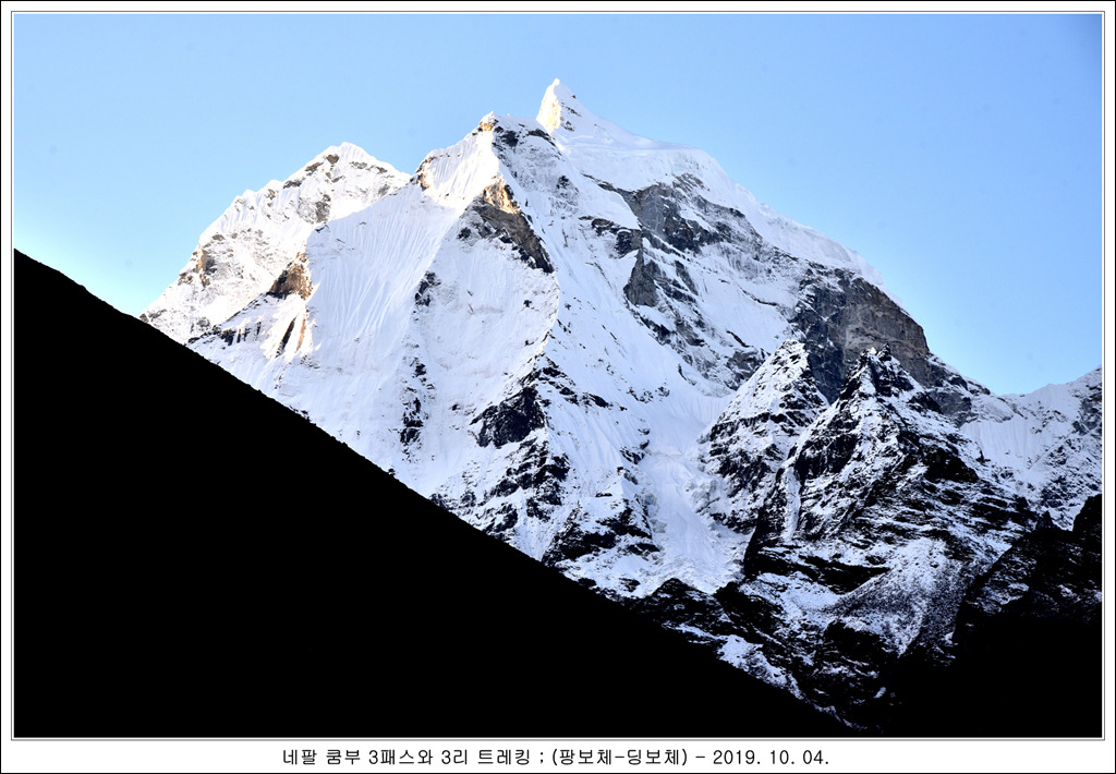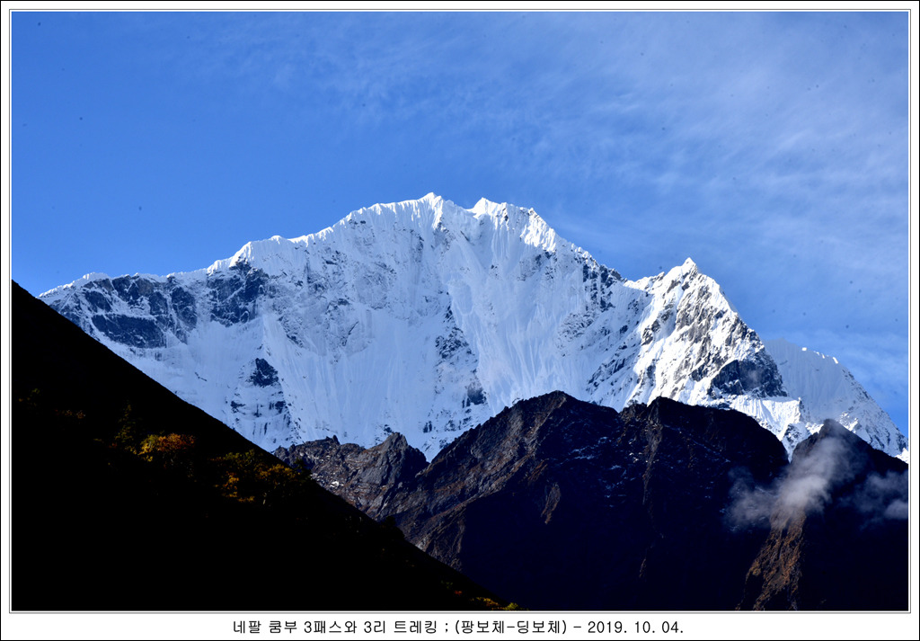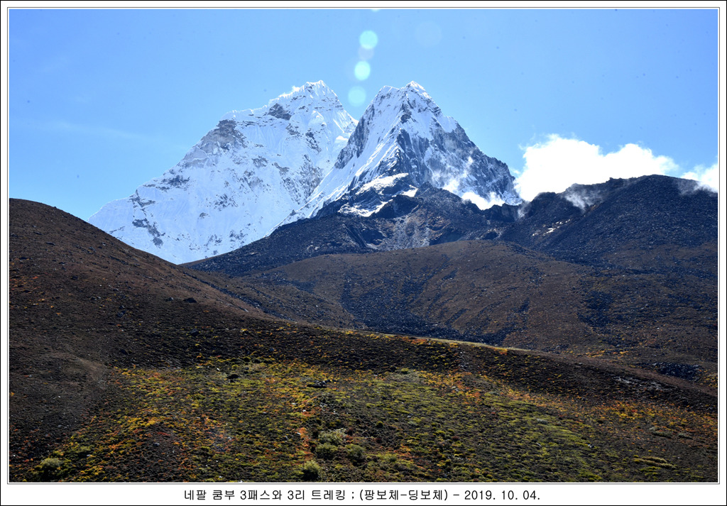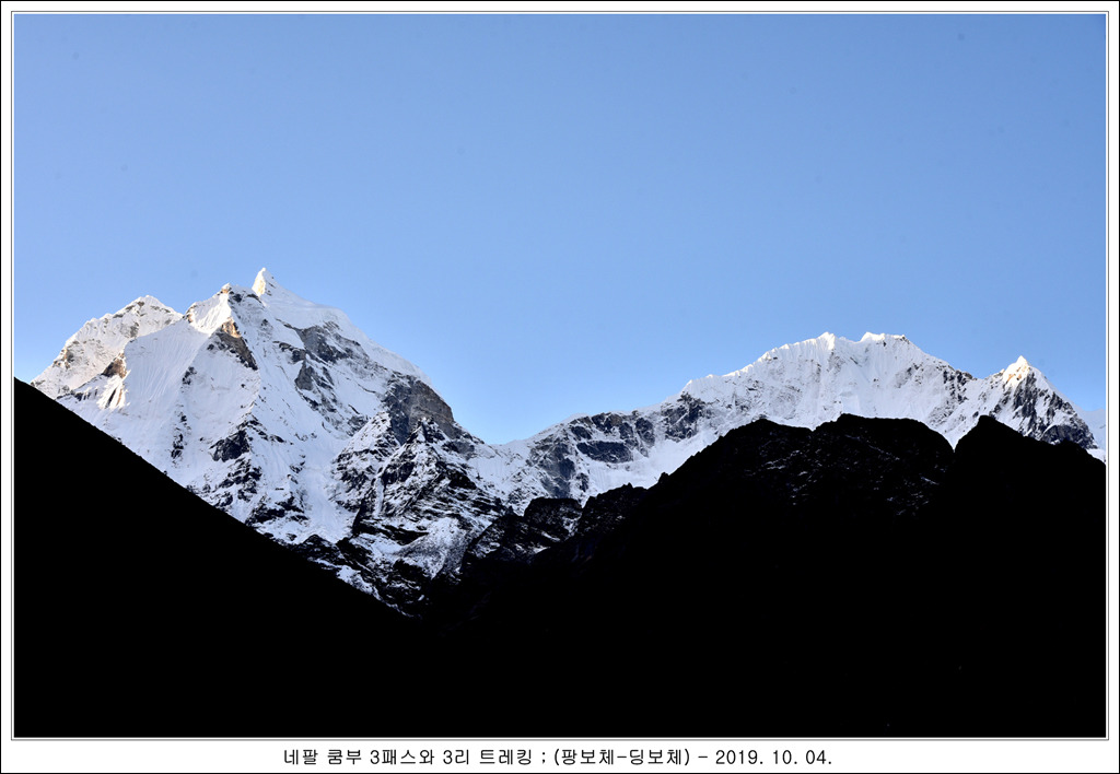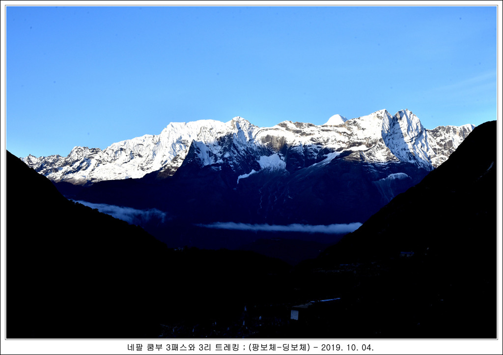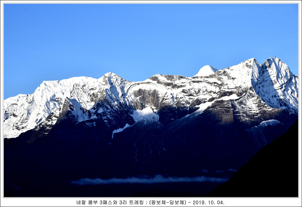 멀리 좌측에 로체가 보입니다, 쿰부에서 본 8천미터 이상의 산은 에베레스트. 로체. 초오유 3개의 산이 있습니다
